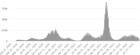Vaccination: 12.72 billion doses of vaccine injected (+20 million doses). (Latest data available). HAITI: According to the Ministry of Public Health, +39 new cases of Covid-19 and its variants have been confirmed in Haiti as of September 4, 2022 (latest partial data available ) for a total of 33,658 confirmed cases throughout the national territory (48.8% women and 51.2% men), since the first case (March 19, 2020 https://www.haitilibre.com/en/news-30319-haiti-health-origin-of-the-first-2-cases-of-covid-19-in-haiti.html ). Previous update (+68 cases as of September 2, 2022). Healings: 31,071 (+65) Cure rate: 92.31% (+) Deaths: 851 deaths (+2 West, +3 Center) Death rate: 2.52% (+) Screening since the start of the pandemic: 220,667 tests since March 19, 2020 (+385 in 2 days) a number of tests for the entire national territory, statistically insufficient to be representative of the health situation , which results in a number of daily confirmed cases that is largely underestimated in the opinion of health specialists. Haiti: Active Cases Trend: (less recoveries and deaths)