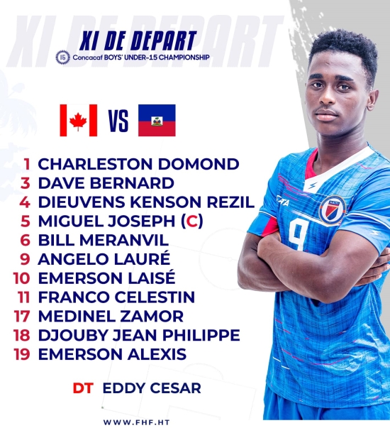 Thursday, August 10, 2023 in the quarter-finals of the Men's U-15 Championship of the Confederation of North America, Central America and the Caribbean (CONCACAF) our young Grenadiers U-15 (league A) , faced "The Reds" of Canada (given favorite) on the lawn of the Olympic Stadium Felix Sanchez, in Santo Domingo in the Dominican Republic. Throughout the match, Eddy César's players valiantly resisted the onslaught of the Canadians who largely dominated the game, but who failed to shake Charleston Domond's nets. Our Grenadiers have repeatedly shown themselves to be very dangerous in their attacks. At the end of the first period the score was still [0-0]. Upon returning from the locker room our Grenadiers created several chances without being able to materialize them, one had until 55' for Bill Meranvil opened the scoring for Haiti on a pass from Franco Celestin [1-0], with an unstoppable shot at the entrance to the penalty area which leaves the Canadian goalkeeper without reaction. Score unchanged at the end of the match. Thanks to the goal scored by Bill Meranvil, our Grenadiers (double champion of the CFU Challenge series 2021 and 2022) offered Canada and qualified for the semi-finals where they will face the United States victorious over Guatemala [4-1] . United States which had won the group stage victory against Haiti [3-0] https://www.haitilibre.com/en/news-40211-haiti-flash-humiliated-by-the-usa-[3-0]-haiti-remains-qualified-for-the-1-4-finals.html on a ground soaked by the heavy rains barely passable from the Pan-American Stadium of San Cristóbal which considerably handicapped the games of our Grenadiers. The time for revenge has come, Grenadiers on the attack! Starting XI : For this quarter-finals, compared to the last two outings against Qatar and the United States, coach Eddy César has made only one change, it is the scorer of the victory (1-0 ) against Qatar, Angelo Lauré, rewarded with a tenure in attack, replacing Jackson Saintinord.