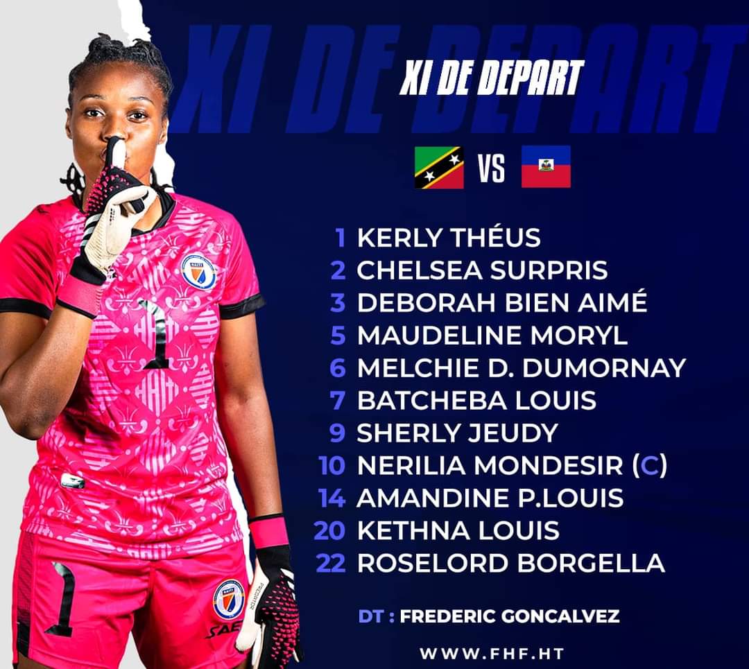 Thursday October 26, 2023, as part of the qualifications for the first edition of the Gold Cup W 2024, from the Confederation of North America, Central America and the Caribbean (CONCACAF) zone, our Grenadières in the Group C faced the "Sugar Girls" of St Kitts & Nevis in Basseterre on the lawn of Warner Park Stadium. Starting XI: #1 Kerly ThéusKerly Theus: (FC Miami, USA) #2 Chelsea Surprised: (Grenoble Foot 38, France) #3 Deborah Bien-Aimé (Florida Int. Univ, Miami) #5 Maudeline Moryl: (Grenoble Foot 38, France) #6 Melchie Daelle Dumornay: (Olympique Lyonnais, France) #7 Batcheba Louis: (FC Fleury 97, France) #9 Sherly Jeudy: (RC Lens, France) #10 Nerilia Mondesir: (Montpellier HSC, France) #14 Amandine Pierre-Louis: (Canada) #20 Kethna Louis: (Montpellier HSC, France) #22 Roselord Borcella: (Le Havre, France) Summary: Our Grenadières imposed themselves without difficulty on the "Sugar Girls" of St Kitts & Nevis, visibly overwhelmed by the events against a team which outclassed them, helpless, conceding 11 goals including a quintuple from Melchie Daelle Dumornay alias "Corventina", a hat-trick from Nerilia Mondesir aka "Nerigol" and three other goals scored by Kethna Louis, Roselord Borgella and Darlina Florsie Joseph. At half-time, our Grenadières were leading [8-0] against the “Sugar Girls” who watched helplessly as our girls played, of which they were the victims… Goals: Melchie Dumornay 13', 29', 32', 45+5', 56' Nérilia Mondesir 20' (P), 44', 89' Kethna Louis 26' Roselord Borgella 36' CONCACAF video https://www.youtube.com/watch?v=wBijTPBLVuk Group C classification: #1 Haiti 6 points +12 (2 match) #2 Costa Rica 3 points +10 (2 games) #3 St Kitts & Nevis (0 pt - 22, 2 matches). The Grenadières thus regain first place in group C with 6 pts + 12.2m ahead of the Costa Ricans 3 pts +10.2m and St Kitts & Nevis (0 pts - 22.2m). Next Matches : Return match (Haiti-St Kitts & Nevis) Monday October 30, 2023 in Basseterre on the pitch at Warner Park Stadium. Return match Haiti - Costa Rica on November 30, 2023 in San Jose, last group match which could be decisive. Remember that if our Grenadières finish first in Group C, they will be qualified directly for the Gold Cup which will take place from February 20 to March 10, 2024 in the United States. See also : https://www.haitilibre.com/en/news-40556-haiti-news-zapping.html https://www.haitilibre.com/en/news-40548-haiti-news-zapping.html https://www.haitilibre.com/en/news-40540-haiti-news-zapping.html https://www.icihaiti.com/en/news-40527-icihaiti-gold-cup-w-2024-our-stars-have-arrived.html BF/ HaitiLibre