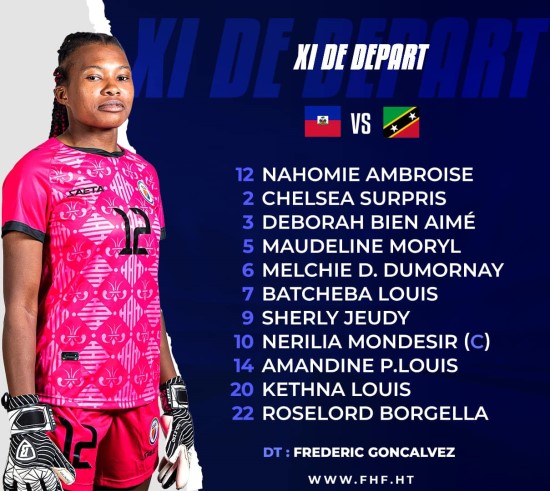 Monday October 30, 2023, as part of the qualifications for the first edition of the Gold Cup W 2024, from the Confederation of North America, Central America and the Caribbean (CONCACAF) zone, our Grenadières in the Group C faced the "Sugar Girls" of St Kitts & Nevis in Basseterre on the lawn of the "SKNFA Technical Center". Starting XI : #12 Nahomie Ambroise: ((Little Haiti, Miami, USA) #2 Chelsea Surprised: (Grenoble Foot 38, France) #3 Deborah Bien-Aimé (Florida Int. Univ, Miami) #5 Maudeline Moryl: (Grenoble Foot 38, France) #6 Melchie Daelle Dumornay: (Olympique Lyonnais, France) #7 Batcheba Louis: (FC Fleury 97, France) #9 Sherly Jeudy: (RC Lens, France) #10 Nerilia Mondesir: (Montpellier HSC, France) #14 Amandine Pierre-Louis: (Canada) #20 Kethna Louis: (Montpellier HSC, France) #22 Roselord Borcella: (Le Havre, France) For the return match against St Kitts & Nevis, coach Frédéric Gonçalvez announced a starting lineup almost identical to that of the first match won [11-0] by Haiti. The only change, Nahomie Ambroise, starter against Costa Rica [1-0] in September, is back in the cage.