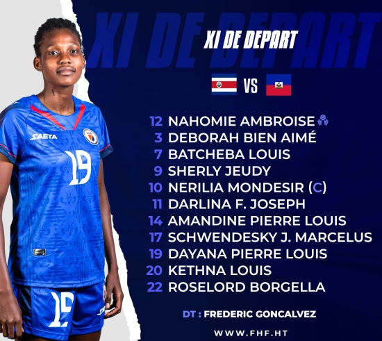 Thursday, November 30, 2023 as part of the qualifications for the Gold Cup W 2024, from the Confederation of North America, Central America and the Caribbean (CONCACAF) zone, our Grenadières leader of Group C faced each other in a match return the "Ticas" of Costa Rica, on the lawn of the "Alejandro Morena Soto" stadium in the province of Alajuel where Haiti experienced defeat [2-1] after 3 consecutive victories. Starting XI: #12 Nahomie Ambroise (GK) #3 Deborah Beloved #7 Batcheba Louis #9 Sherly Jeudy #10 Nérilia Mondesir #11 Darlina Joseph #14 Amandine Pierre-Louis #17 Shwendensky Joseph #19 Dayana Pierre-Louis #20 Kethna Louis #22 Roselord Borgella For this match, Franco-Portuguese coach Frédéric Gonçalvez presented a unique starting lineup with attacker Roselord Borgella in central defense.