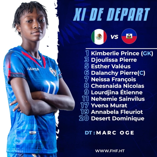 Monday February 5, 2024, for their 3rd and final Pool match of the Confederation of North, Central America and Caribbean (CONCACAF) Women's U-17 Championship, qualifier for the 2024 World Cup in the category, our Grenadières 2nd in Group A, already qualified for the semi-finals after their victory [2-1] against the "Ticas" of Costa Rica https://www.haitilibre.com/en/news-41573-haiti-u17-women-s-championship-victory-for-haiti-[2-1]-against-costa-rica-video.html and that [5-3] against the "Cuscatlecas" of El Salvador https://www.haitilibre.com/en/news-41588-haiti-u-17-women-s-championship-victory-for-haiti-[5-3]-against-el-salvador-qualifies-for-the-semi-finals-video.html nos Grenadières were severely defeated [4-0] by the "tricolor" of Mexico. Starting XI: Marc Ogé made a very small change compared to the previous alignments with the return of Néhémie Sainvilus in place of Pierreline Nazon.