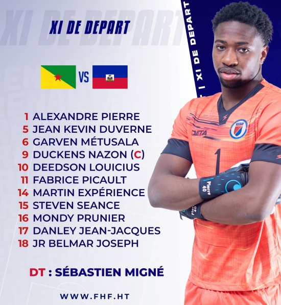 This Saturday, March 23, 2024, our Grenadiers on the lawn of the Edmard Lama Stadium in Cayenne, faced the local team "Yana Dòkò" from French Guiana in a friendly match. This match is part of the preparation of our Grenadiers for the qualifying phase of the Confederation of North America, Central America and the Caribbean (CONCACAF) for the 2026 FIFA World Cup, which will take place in three countries Canada, Mexico and the United States for the very first time. Starting eleven : For this friendly match between the Grenadiers and the "Yana Dòkò" of French Guiana the new French coach Sébastien Migné https://www.icihaiti.com/en/news-41843-icihaiti-football-sebastien-migne-new-coach-of-the-grenadiers-senior.html revealed its first team composition with Duckens Nazon as captain (Ricardo Adé being out). A choice which underlines Migné's confidence in Nazon's experience to guide the team on the pitch.