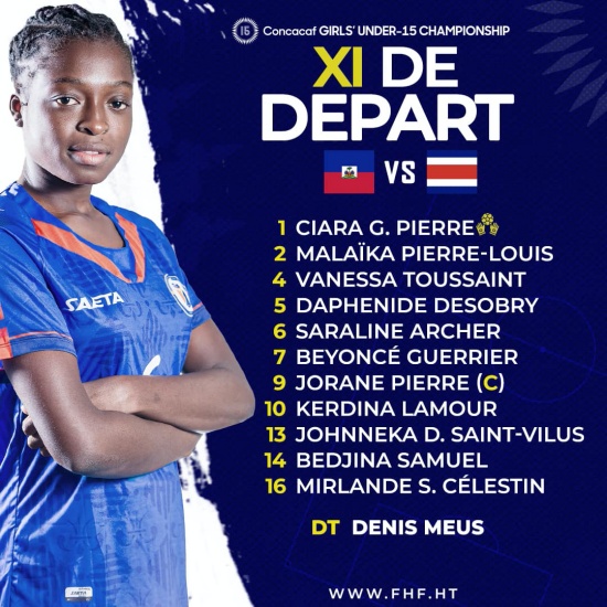 This Monday, August 5, 2024, as part of the 5th edition of the Confederation of North, Central American and Caribbean States (CONCACAF) U-15 Women's Championship, our young Grenadières who are in Costa Rica (host country) will face the Costa Rican selection in the opening match of Group A (League A). Coach Denis Meus unveiled the final list of players called up, composed largely of young hopefuls from the national "Grassroots" festival organized by the National Technical Directorate of the Haitian Football Federation (FHF) https://www.icihaiti.com/en/news-42516-icihaiti-grassroots-hinche-festival-detection-sessions-for-the-u-15-women-s-selection.html . Our Grenadières have already been working in Alajuela (Costa Rica) since Saturday, August 3rd https://www.icihaiti.com/en/news-42906-icihaiti-u15-championship-our-grenadieres-in-costa-rica-calendar.html List of U-15 players summoned : Goalkeepers : Cuerda Charles, AFET Ciara Pierre, Le Jardinier Defenders : Malaika Pierre-Louis, Celtic Vanessa Toussaint, Miragoâne Academie Wood Caina Jean, Efismo Daphnide Desobrv, RJM Jhonneka D. Saint-Vilus, Exafoot Shelleda Etienne, Aigle Brillant Midfielders : Saraline Archer, Exafoot Kerdina Lamour, Celtic Manaissa Noel, CFSFLU Myrlande E. Celestin, RJM Keisha Maranaelle Gue, Surf Las Vegas (USA Forwards : Woodmalie Lacroix, CFSFLU Rood Jaelle Paulemond, AST Jorane Pierre, Real Jongleuse Beyoncé Cuerrier Bedjina Samuel, FCD Note that midfielder Keisha Maranaelle Gue is the only expatriate player in the U-15 selection called up by the coach. Like her older brother All Branly Gue (U-20 men), she immigrated to the United States after growing up in Aquin (Southern Haiti). Keisha currently plays for Surf Las Vegas in California. She has just returned from a tour of Europe with her club and is now ready to serve the Haitian team. Keisha aims to make a career in the national team, all categories combined. Starting lineup :