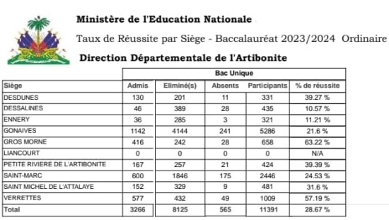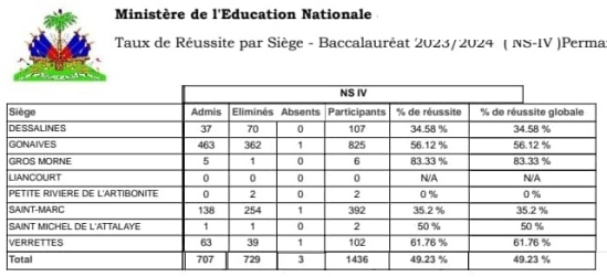 Department of Artibonite (2nd session of failed candidates, permanent Baccalaureate): Out of a total of 1,436 participants, 707 candidates were admitted, representing a success rate of 49.23% (a sharp increase of 31.45% in 2023)