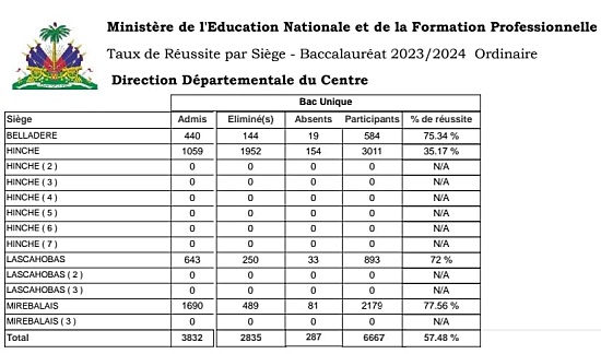 The Ministry of National Education informs that the results of the secondary school leaving exams (BAC 2023-2024) are currently available for 7 Departmental Directorates of Education (DDE): Center, Artibonite, Grande Anse, Nippes, South, North and North-East. According to the information provided by the National Office of State Examinations (BUNEXE), : Department of the Center single bac (end of secondary studies): Out of a total of 6,667 participants, 3,832 candidates are admitted, i.e. a success rate of 57.48% (slight decrease to 57.62% in 2023).