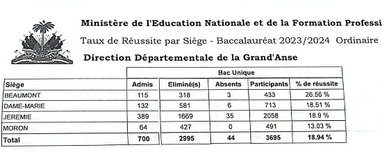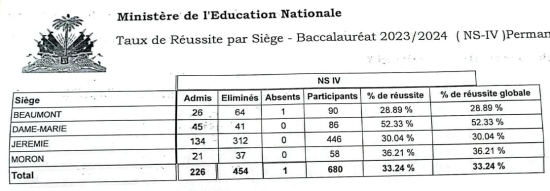 Grande Anse Department (2nd session of those who failed, permanent Baccalaureate): Out of a total of 680 participants, 226 candidates were admitted, representing a success rate of 33.24% (up 24.02% in 2023)