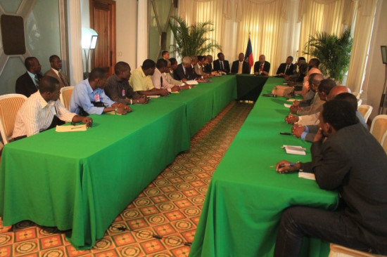 Michel Martelly, the President of the Republic, accompanied by Prime Minister Garry Conille, some members of the Haitian government and parliament, met yesterday Thursday at the National Palace, the highest authority of the State University of Haiti (UEH) and a group of students representing the various entities of the UEH. The Head of State, by this meeting, begins the process of supervision and of strengthening of the State University of Haiti, one of its promises electoral campaign promises. During this long discussion with the authorities of the UEH, various points were discussed, such as the inventory of the training at the level of the UEH, its importance in the development of the country, the integration of young graduates in public administration, the direct involvement of the university in the major decisions in favor of change, the capacity of the institution, etc... "The University is of less in less able to play its role" said Jean Henry Vernet, Rector of the UEH who, while congratulating the President Martelly for this noble initiative, believes necessary to establish a formal framework for cooperation with state institutions and to establish a tripartite working group Government/Parliament/UEH. The President of the Republic, while promising them his support, invite those responsible of the institution to go to work to establish the new foundations of a state university, with its own campus, a modern curriculum which satisfies to the requirements of development, and a qualified teaching staff.