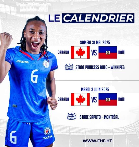 Mathes Schedule in Canada : • Saturday, May 31, 2025 at Princess Auto Stadium in Winnipeg, Manitoba • Tuesday, June 3rd, 2025 at Saputo Stadium in Montreal, Quebec BF/ iciHaiti