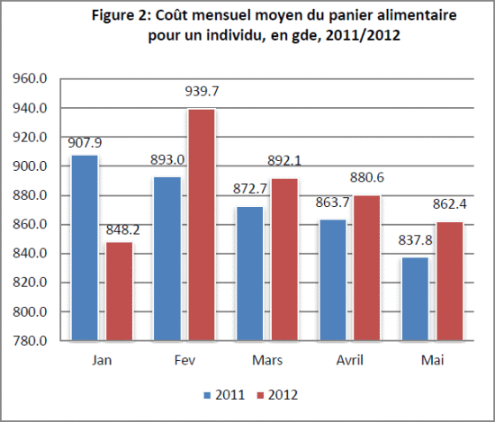 Evolution of the cost of food basket : After a rebound of over 10% between January and February 2012 due to major changes in the price of beans (21%) and cooking oil (over 32%), the cost of food basket has shown a tendency negative, from March to May (Figure 2). It varied from nearly -4%, from 939.74 gourdes in February to 892.1 gourdes in March. This trend continued in April and May, although more weakly : -1.3 and -2.1%, respectively.