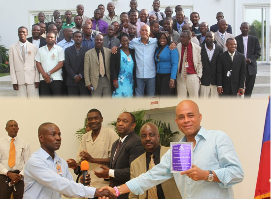 Wednesday, at the National Palace, the President Michel Martelly, met in a cordial atmosphere, fifty political leaders of the Southern Department. The objective of this meeting was basically to strengthen the links with them and inquire about their expectations and the difficulties faced by their respective communities. Accompanied by Ronsard Saint Cyr, the Minister of the Interior and Territorial Communities, Serge Chery, the Departmental Delegate of South and Guyler C. Delva, the Secretary of State for Communication, the Head of State made overall considerations on the socio political conjuncture and reviewed all its achievements especially at the level of Department of the South, namely : the historic achievement of Carnival 2012, the construction of the road section of Gelée, the start of construction work of the Hospital OFATMA, the infrastructure works underway in the city, the construction of several school infrastructure... In their various interventions, political leaders, explained the difficulties encountered at the level collective and individual and asked to the Head of State to to envisage punctual solutions. They reaffirmed their determination to accompany the President Martelly in the realization of its political vision which focuses on major projects predominantly social.