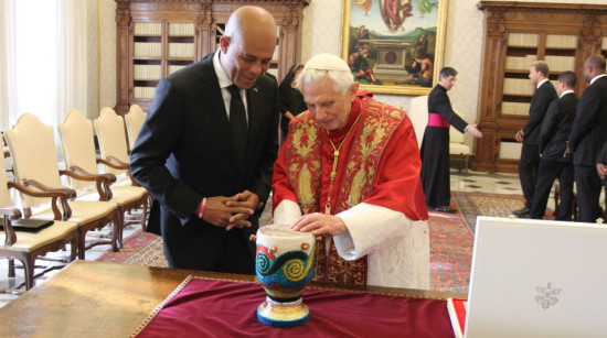 This Thursday, November 22, 2012, the President Michel Martelly that completes his European tour, was received in audience by Pope Benedict XVI. Upon arrival, the Head of State, received to the Holy See (Vatican), a warm welcome from Mgr Angelo Acerbi, with whom he had a fraternal dialogue, in the presence of Mgr Jose Avelino Bettencourt, Chief of Protocol of the Vatican. According to a statement from the Vatican, during their talks, the two men confirmed the good relations between the Holy See and the State of Haiti. He was also pointed out the particular contribution offered by the Church through its educational, social and charitable activities, especially during the earthquake that struck the Haitian people and the reconstruction phase. During the conversation, was treated with a particular interest the importance to continue the cooperation, for the harmonious development of the society in Haiti. The President Martelly has also met with Cardinal Secretary of State Tarcisio Bertone and Mgr Dominique Mamberti, Secretary for Relations with States.