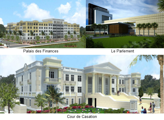 The cost of construction of the Ministry of Foreign Affairs, is estimated at $17.5 million (Funding: PetroCaribe-Treasury), and will create 150 jobs. The building is under construction, difficulties were encountered in excavations (organic matter and rainfall), beginning of backfilling, end of work is scheduled for March 2014. The cost of construction of Palace of Finance (MEF, AGD, DGI), is estimated at $40 million (Funding: IMF debt relief). Plans are underway, the start of construction is scheduled for June 2013 and the end of December 2014. The cost of construction of Parliament, is estimated at 33-34 million, depending on the option chosen (Financing: Debt Relief IMF) and will create 275 jobs. Plans are completed, pending parliamentary approval, the end of work is scheduled for January 2015.