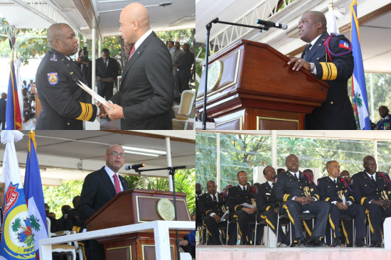 The ceremony was attended by Prime Minister Mr. Laurent Salvador Lamothe, of Minister of Justice and Public Security, Jean Renel Sanon, members of the High Staff of the PNH, the civil and religious authorities and personalities of the Diplomatic Corps and representatives of the international community, in the premises of the police academy. During the ceremony the DG of Police declared, "I know all the resentments and individual dissatisfactions that demotivate the staff and ultimately rob the police institution of its most deserving executives, so today I want to tell you that no one is better placed than I to know the extent and validity of claims ," with his 17-year career in the police force where he rose through the ranks, adding that ""[...] And of course to meet your expectations. Fortunately,that the problem of weapons is already in stage of resolution since we just received 11.000 of 5.000 pistols already ordered, we can easily observe deficits in infra-structural areas in the field of regulation and supervision in the field of strategic planning, in technical and operational causing both a precarious situation structural that a phenomenon of organizational instability non-conducive to the implementation of a sustainable security policy. In his speech he highlighted the deficiency in deficit of management of human resources "...unfortunately I have to mention an even more glaring weakness suffered on a recurring basis the PNH is the lack of human resources, it is precisely this major problem that my administration intends to tackle in the short term." Godson Aurélus also intends to take action against the police officers with behaviors who disagree with the principles of the institution, Protect and Serve. The police will be "one of the pillars on which will be built Haiti's development," said for his part, President Martelly, adding that the police must work towards the establishment of the rule of law, of which will result a safe environment conducive to investment, the police officer be an agent of development, "National Police of Haiti is one of the pillars on which will be built Haiti's development," added President Martelly, who welcomed the efforts of the former Director General of the PNH to strengthen the police force, has asked to the new Commander to move forward, to perfect what has been built, to strive to reduce deficiencies which, at certain moments, hinder the effective intervention of the body, in exchange, he expects that the PNH creates more credibility, prestige and respect within society ; banditry, in all its forms, is curbed and that the families are more bereaved by crime ; be established again in our country, once renowned for its relaxed lifestyle, the peace of hearts and minds that allowed each and others to go about their activities peacefully.