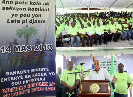 Thursday, as part of a meeting organized by the Ministry of the Interior and Territorial Communities (MICT), the President Michel Martelly, accompanied by David Bazile, Minister of the Interior and Territorial Communities, of Mrs. Marie Félix Mimose, Minister responsible for the promotion of the peasantry and of François Thomas, the Minister of the Environment, participated to the municipal Palace of Delmas, to a working meeting with members of the National Federation of Boards of Communal Sections (CASECs) and of Administration of Communal Sections (ASECs) of the country. The Head of State has reminded CASECs ASECS and they are the driving force of Haiti, given their extensive knowledge of the country. "To realize my dreams and goals, you are the safest corridor," while stressing the importance of the meeting between the central power and the representatives of all the Communal Sections of the country. The Head of State recalled the efforts of the Administration Martelly-Lamothe, to provide sustainable solutions to the fundamental problems of Haiti. So he sought the support of all Haitians, the goodwill of all and stressed the necessity for the State to support the actions of CASECs and ASECs, through various development programs. During this meeting, which was held under the theme : "Ann pote kole ak seksyon kominal yo pou yon leta pi djanm", various issues were discussed, including issues related to rural development. The various speakers mentioned the government's social programs and the functioning of local authorities.