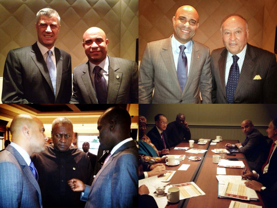 Arrived in New York on Sunday evening, at the head of a large Haitian delegation to attend the 68th Ordinary Session of the UN General Assembly, the Prime Minister, Laurent Lamothe attended the same evening at a reception in honor of delegations by President Obama. Monday, Laurent Lamothe began his first day in New York, by a meeting with Dr. Jim Yong Kim, President of the World Bank, which was attended by former British Prime Minister Tony Blair, President of the Republic of Ghana, John Dramani Mahama, the President of the Republic of Malawi, Joyce Banda,Prime Minister of Ethiopia, Haile Mariam Dessalegn and Prime Minister of Albania, Edi Rama. This working session was intended to create a body to monitor development projects in developing countries, who know all the same problems (often donors pose their conditions without ensuring real priorities of recipient countries). This proposal for the creation of a body to monitor projects, of the President of World Bank and of Mr. Blair, was welcomed by the participants who did not hesitate to share their experiences and to seek the creation of a common mechanism likely to solve these problems. Prime Minister Lamothe, then met his Kosovo counterpart Hashim Thaçi who was accompanied by his Foreign Minister, Enver Hoxhaj. Discussions focused on the status of Kosovo, which wants the support of Haiti to benefit from the support of CARICOM member states in the UN. They wanted to go to Haiti to continue the discussions and eventually explore avenues of cooperation in the field of education, on this point, the possibility of granting scholarships to Haitian students was discussed.