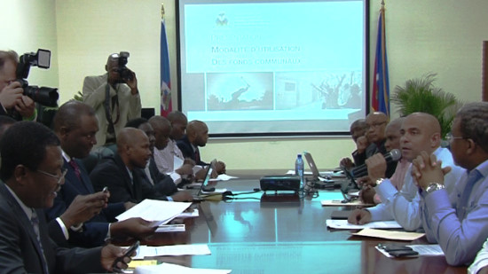 The Prime Minister, Laurent Lamothe, held at the Ministry of Planning and External Cooperation, an important meeting on the management of communal funds, which was attended by, among others, Jacques Rousseau, Minister of Public Works, Transportation and Communications, Ralph Théano Minister delegate to the Prime Minister for Relations with Parliament, Jean Tholbert Alexis, President of the Lower House and several senators and deputies. Laurent Lamothe recalled that "the Government runs more than 187 community development projects throughout the country, for a budget of around 1.4 billion gourdes, with 10 million gourdes per municipality. Of these 187 projects, 71 are already completed. Announcing that the Martelly administration would double the number of projects for the population under the Finance Act 2013 to 2014. Recall that through the implementation of these programs, which aim to develop municipalities, the government team intervenes in several areas such as drinking water, construction of markets, construction of schools and health facilities. The Prime Minister has indicated that in order to better coordinate these programs of communal development and in the interests of transparency, Steering Committees and of monitoring have been established involving the Primature, the sectoral ministries and parliamentarians to ensure the progress and sustainability of projects. He also suggested the participation of the Presidents of the various parliamentary blocs in these Committees.
